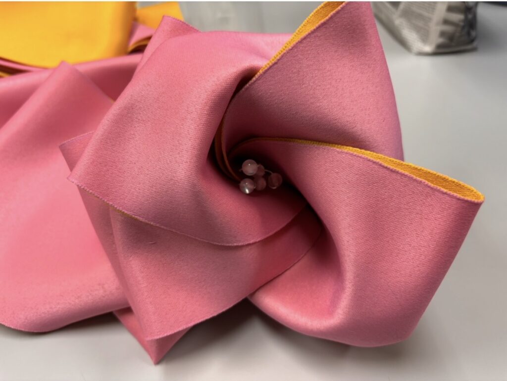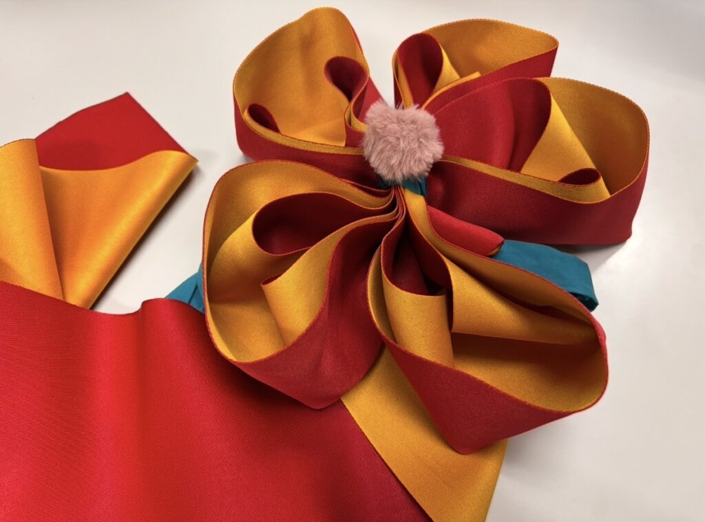 花笠音頭を踊るので、帯で花をつくる「花帯」を結っています。